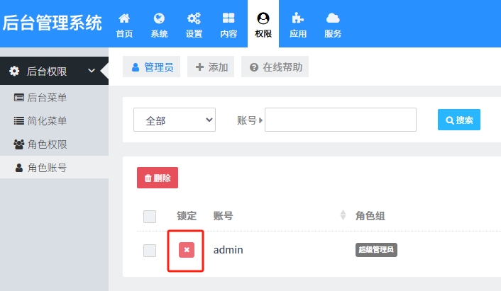 - 登录后台,找到:权限-角色账号,如下图;将对应的锁定选x即可。