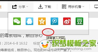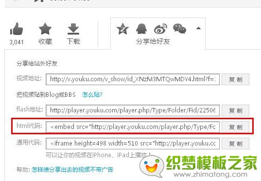 以添加优酷视频为例,首先打开优酷网具体的视频页面,然后会在视频下面看到如图一的分享按钮,复制html代码;