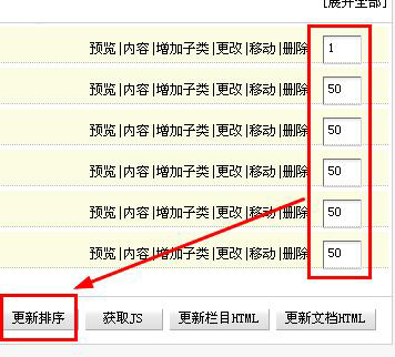 如图所示,在栏目管理界面,修改对应栏目后面的数字即可调整栏目的排列顺序。记住:数字越小越靠前