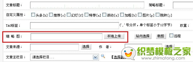 在织梦后台中,已经有了缩略图的位置,很多人没有留意,如图所示,直接本地上传,或者站内选择后下即可