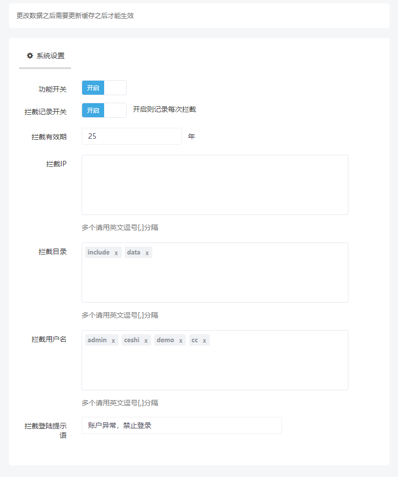 - 自定义用户名拦截如前端尝试登录此用户名,会自动拦截并记录,同时拉黑访客IP